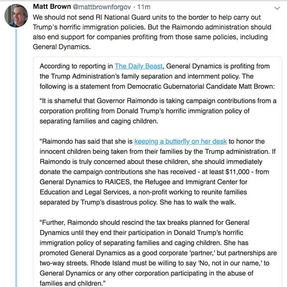Consider the fact that Brown specified Raimondo should rescind her recently announced $34-million subsidy package to General Dynamics-Electric Boat “until” the company ends its complicity in tearing immigrant children from the arms of their parents.